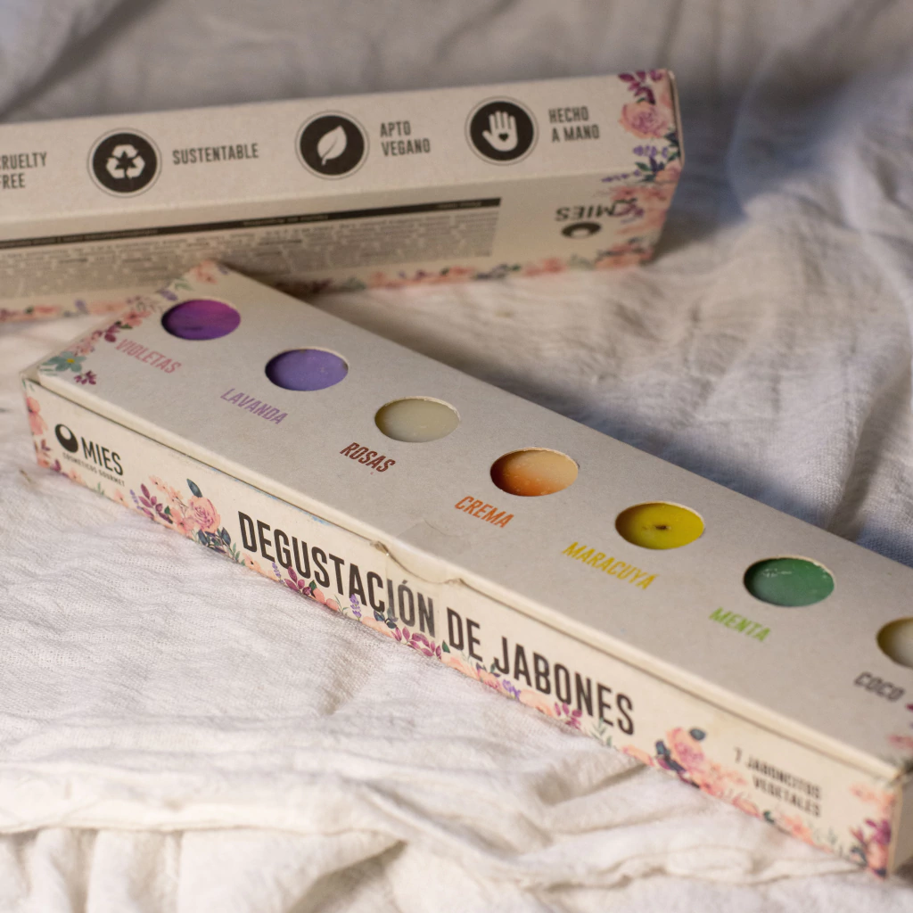 Esta hermosa caja, ideal para regalar, consiste en una degustación de 7 jabones MIES: NÉBULA (de violetas).DORMILÓN (de lavanda), ROSAS, SUSPIRO LIMEÑO (de crema y vainilla), BUENAS BRIVAS (de maracuyá), MENTIME MÁS (de menta y eucaliptus). COCONUT (de codo)